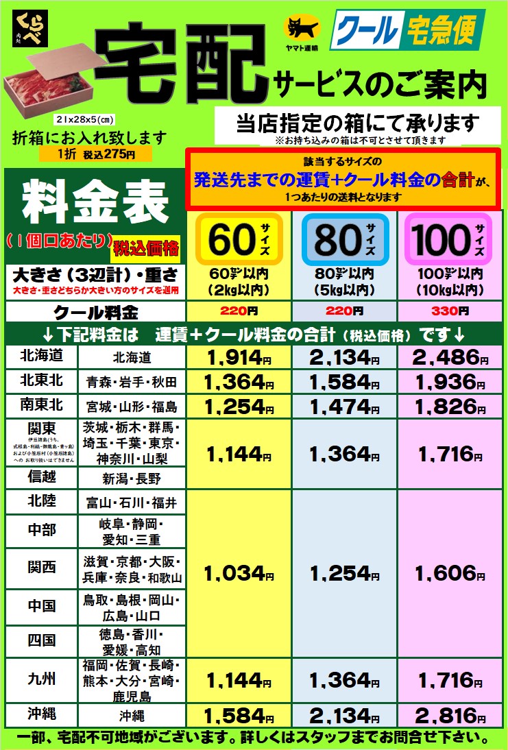 店舗にてお買い求め頂いた商品を地方に発送できます!! ヤマト運輸様のクール便にてお送りいたします。弊社にて専用の箱をご用意し、梱包から発送まで行います。 ※箱代250円(税込)別途頂戴いたします。 料金については荷姿・重量・お送り先により変動いたします。 一部、発送不可な地域がございます。詳しくは店舗スタッフまで!